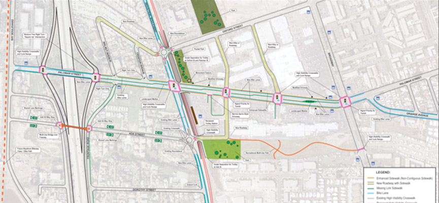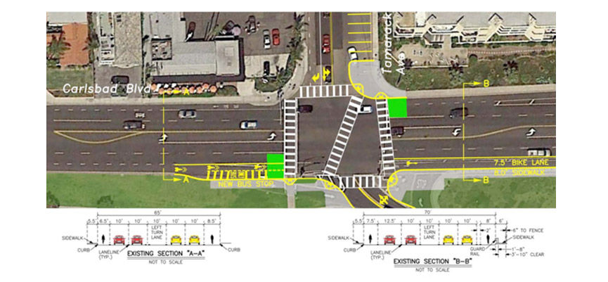 LLG aided in the preparation of a SANDAG Active Transportation Grant submittal package, resulting in the award of a $270,000 grant to the City of Carlsbad, which will be used to provide enhanced facilities for pedestrians, transit users and bicyclists along Carlsbad Boulevard at Tamarack Avenue. The project will establish a new standard for pedestrian scramble crossing, provide actuated “no turn on red” blank out signs and modify traffic detection to count cyclists and provide unique clearance times. The southbound bus stop will be relocated to the near side of the intersection to be closer to the controlled pedestrian crossings and the path to Carlsbad State Beach. Bicyclists will be provided with northbound and southbound bike boxes.